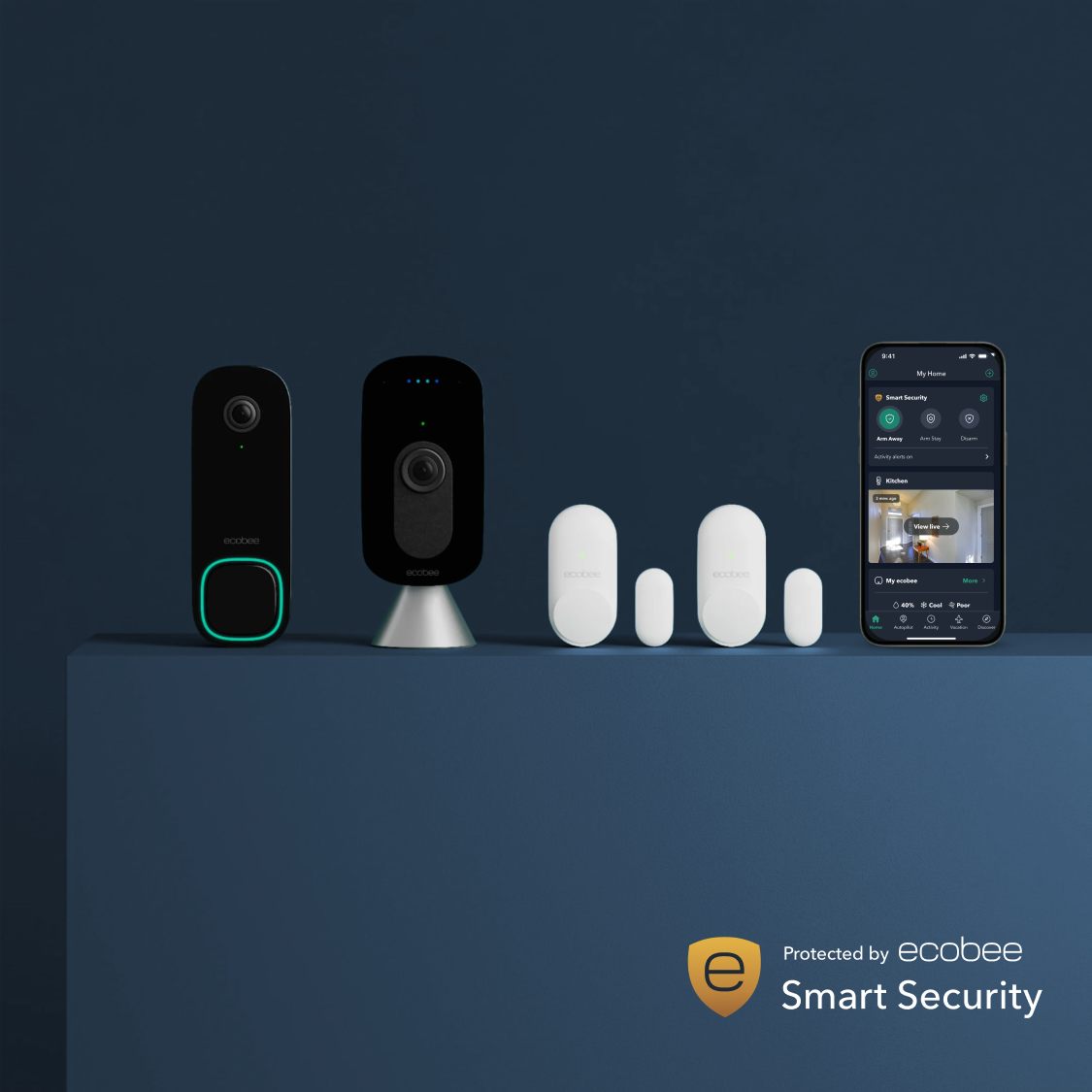 Secure your entryway and your interior with our Smart Doorbell Camera and indoor SmartCamera. Receive instant person and package alerts, and secure every entryway with included entry sensors. One year ecobee Smart Security Advanced with purchase.